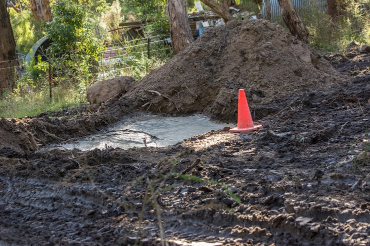 Because we’d had considerable rain on the weekend between week 1 and 2, the billabong started to get considerable amount of water in it – before they were ready to finish working there. A discussion with the landscaper led us to the decision to create a sump, at the bottom of the property, to capture overflow water from the billabong, so our neighbour’s property below, doesn’t get flooded in one section during times of heavy rainfalls – as does happen here in the hills. He has always received run off rain from our property anyway, but we didn’t want him to receive a concentrated amount in just one spot, so this seemed to be the best option. The plan was to fill it with scoria so there’s not a big hole for anyone or anything to fall in, and it will be topped up and then levelled off so it’s part of our garden. I did have visions of the local fox falling into it overnight but thankfully that proved not to be the case. It did take quite a good few weeks for the water to gradually drain away.