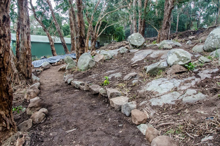 he liners had been delivered for the creek beds and billabong – huge rolls that weighed a great deal but somehow the guys managed to manipulate it and manoeuver it down the hill to where they needed it. In the meantime they had also started on the first garden path, which is above the billabong and creek. Important to get this done as they couldn’t get the equipment in there for much longer. One of the guys found enough small rocks on our property to fully line it both sides. We do have a lot of rocks here. The billabong had to go closer to the centre of the property than the original plan due to a monolith rock being in the way. We were fine with that and knew that changes would occur from the original plan, because of what is underneath the soil. We wouldn’t know what was there till it was found. We have a huge amount of granite through the hills here.
