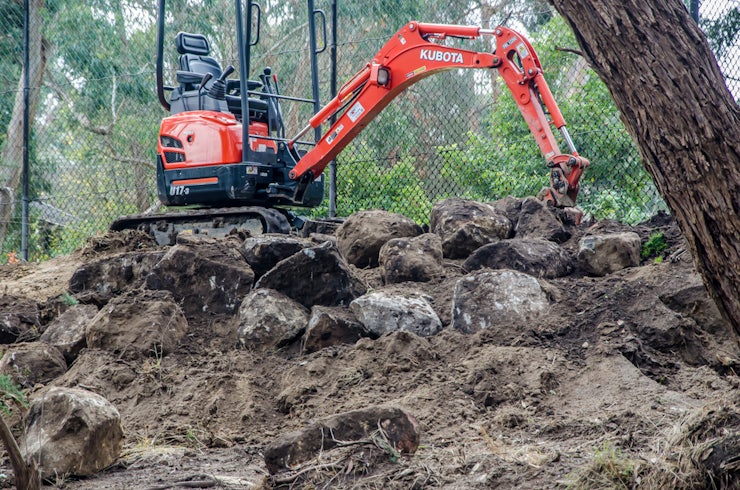 One of the guys manipulated rocks into place along the top of the paddock beside a path below the tennis court. All the vegetation (arum lilies and lots of weeds) had been removed, so this was to help keep things in place. Once they’ve finished working in this area my husband and I will work madly to plant the area up with grasses, ground covers and low bushes. Many plants will be sourced from a local indigenous nursery but others we will source as cuttings or seedlings from friends, and other nurseries that are mainly in the hills region.