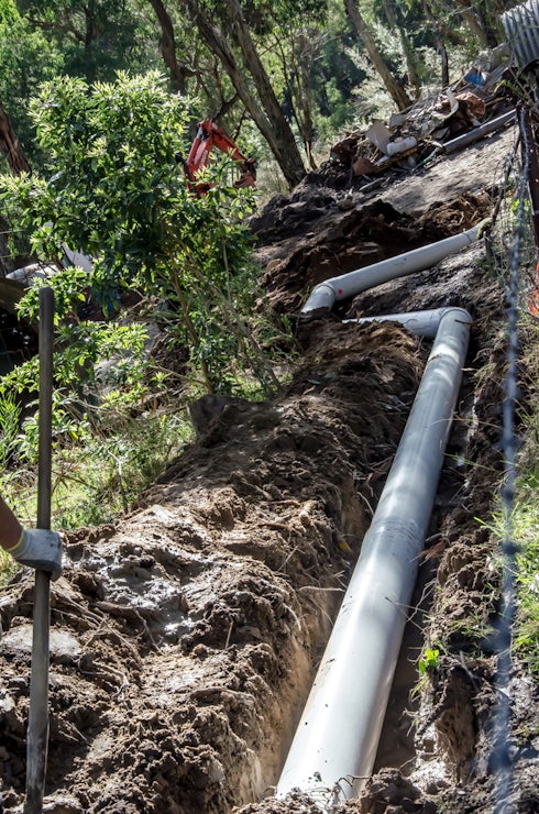 We had to finalise drainage for the overflow from the billabong in times of heavy rainfalls, and although the rain has been a pain in getting this job completed, it actually has been a silver lining, in that it’s shown up possible complications we might not have anticipated had the weather been dry during this operation. Part of our goal was to ensure that our neighbour didn’t get huge run offs from our property – something he’s endured the 30+ years he’s lived here. Part of that is because of rain coming off the street, down our driveway – like a river in heavy falls – and then down the rest of our property, spilling on to his. His garage used to get flooded but now we’ve redirected the water away from there, that’s not happening. Trouble was, the water was more concentrated in one section, across his driveway that runs at the bottom of our property (his property runs beside and below ours) but we’ve now been able to add drainage that steers it away to a corner of his property. We consulted with our landscaper and our neighbour to get this happening. Over time, this should prove to be an effective strategy for him and us.