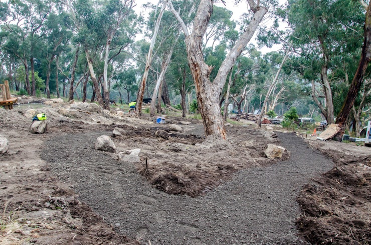 The pathways have now been all mapped out and all have crushed rock toppings on them, ready for the final topping, similar to lilydale topping, only more red. It’s now showing us where all our proposed garden beds are – a daunting but exciting thing too. We have sooooooooo much planting to do and will be calling on family, friends and local groups to help us from time to time. The apprentice has begun lining another pathway, this one below the billabong bank, with small rocks he’s found around the property. We’re amazed at how many he finds! Love the steps they’ve created on a steep path too, to make it easier for us all to negotiate as we walk around.