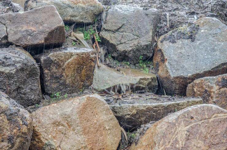 Seeing what has been created by our designer, landscaper and ourselves and how it’s shaping up is indeed a satisfying and exciting thing. Can’t wait to see how it looks once it’s all settled 2-3 years down the track. The more we plant, the less weeds we have to deal with. Above is a rock fall below the bank by the tennis court at the top of the paddock. It’s lovely seeing the rain falling through this area.
